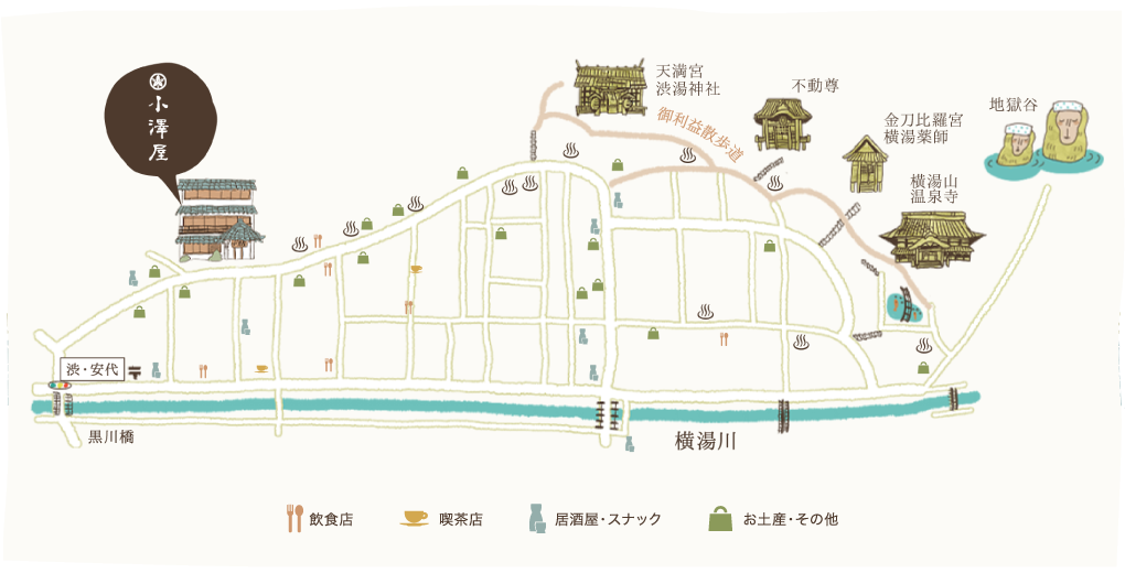さまざまな源泉や効能がある外湯。祈願手ぬぐいを押しながら巡り、締めに 「渋高薬師」へお参りして満願成就を願いながら印を押したら完了です。